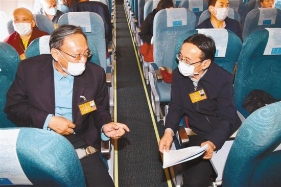 5月20日,全國政協(xié)委員、西藏人民醫(yī)院副院長格桑羅布(左)與全國政協(xié)委員、西藏大學科研處處長圖登克珠在前往北京途中就如何在全國兩會上建言獻策、履職盡責進行交流。本報記者 旦增西旦 攝