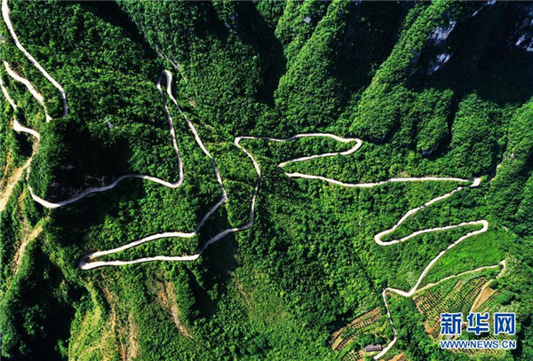 7月3日拍攝的下莊村(無人機(jī)照片)。地處秦巴山區(qū)腹地的重慶市巫山縣竹賢鄉(xiāng)下莊村被稱作“天坑村”。多年來,全村人憑借“不等不靠,幸福要自己造”的精神,走出了自己的一條幸福路。曾經(jīng),四面絕壁猶如一圈難以跨越的高墻,將下莊人緊緊困在里面。閉塞的交通束縛了人們掙脫貧困和封閉的雙手,阻擋著全村通向文明和富裕的腳步。不甘心“坐井觀天”的下莊人,用生命挑戰(zhàn)懸崖,村民拿著鐵釬和鐵錘,在懸崖上鑿出一條“通天路”,徹底改變了村莊的命運。當(dāng)?shù)卣群髮ο虑f村的道路進(jìn)行了加寬、硬化加固,并加裝了護(hù)欄。如今,從下莊出發(fā)到縣城的時間縮短到一個半小時左右。通路后,村里的面貌很快發(fā)生了變化。2015年,下莊村完成整村脫貧。如今,下莊村建立了果蔬種植合作社,巫山縣在這里建立了下莊精神陳列館,建成了風(fēng)貌統(tǒng)一的鄉(xiāng)村民宿,幫助下莊村發(fā)展生態(tài)文旅產(chǎn)業(yè)。曾經(jīng)的“天坑村”靠著自強(qiáng)不息的精神,道路越走越寬。新華社記者王全超攝