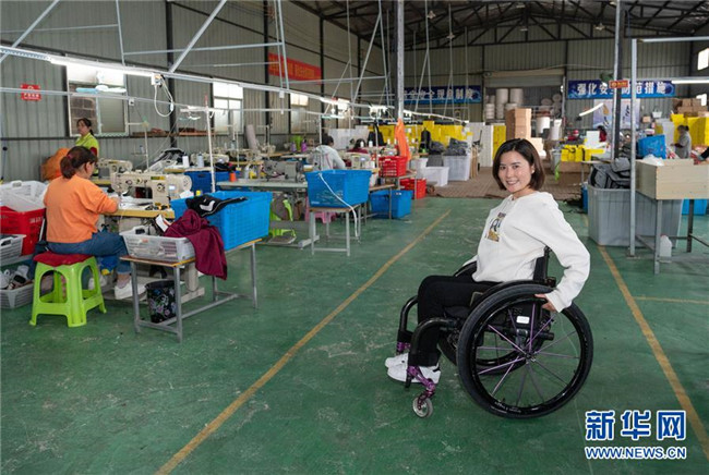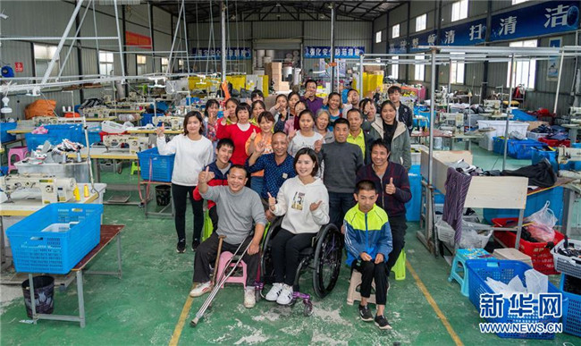 10月13日,在湖南省邵陽市城步縣湖南七七科技股份有限公司生產(chǎn)車間,殘疾女青年楊淑亭(前排中)與工友合影。1991年出生的苗族姑娘楊淑亭因車禍胸部以下高位截癱,通過不斷學(xué)習(xí)摸索,開辦網(wǎng)店并注冊了自己的企業(yè),與周邊貧困家庭簽訂合作協(xié)議,制作售賣具有民族特色的背包和仿真花卉,帶動(dòng)上千名貧困人員及59名殘疾人就業(yè)。