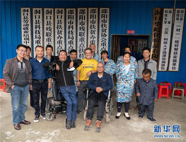 10月13日,在湖南省邵陽市洞口縣華屹化妝品有限公司,殘疾人張赫倫(左五)與他的伙伴們合影留念。42歲的張赫倫在1998年因強(qiáng)直性脊柱炎致一級殘疾,失去生活自理能力。他通過生產(chǎn)洗發(fā)水致富,主動(dòng)吸納18名殘疾人就業(yè),還以“基地+農(nóng)戶”模式帶動(dòng)50多戶貧困戶脫貧致富。