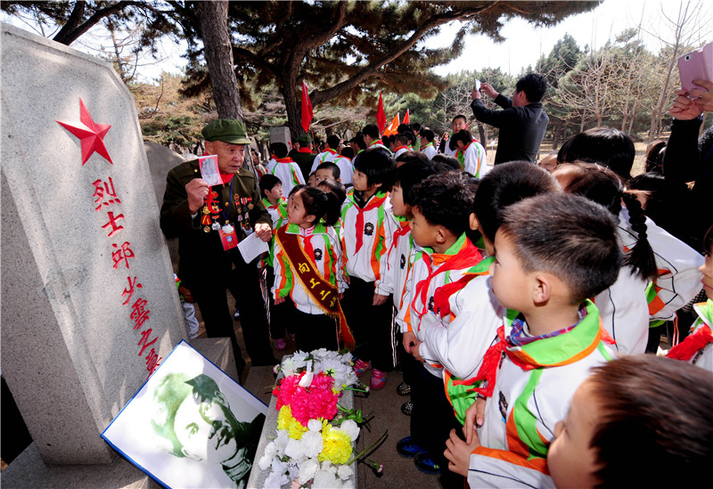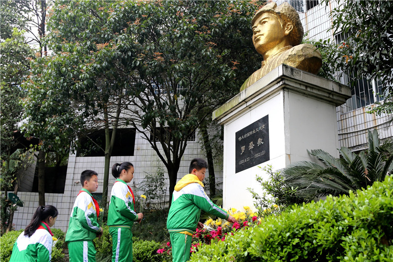 湖南吉首大學師范學院附屬小學學生在為羅盛教烈士塑像獻花(2016年3月31日攝)。新華社發(fā)(彭彪攝)