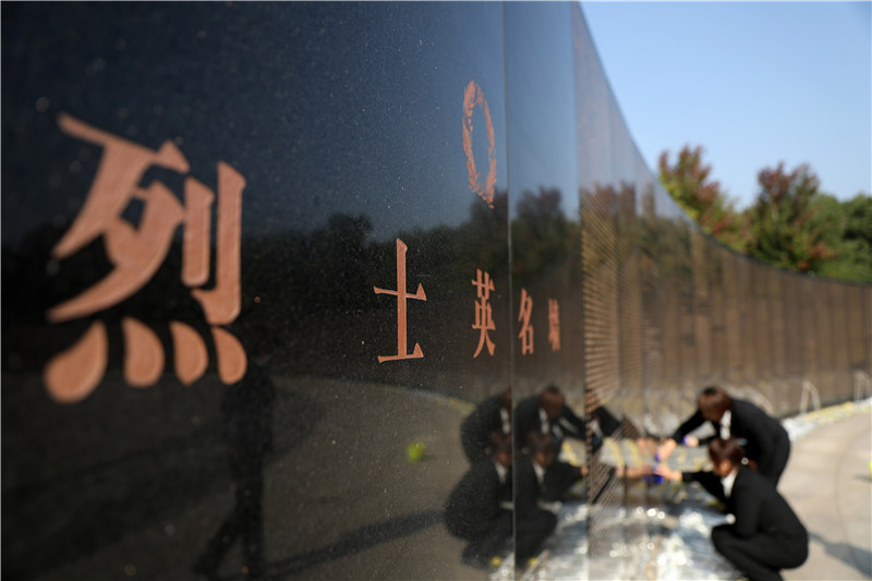 9月27日,沈陽抗美援朝烈士陵園工作人員在擦拭烈士英名墻。新華社記者姚劍鋒攝