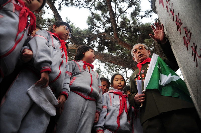 在沈陽抗美援朝烈士陵園,志愿軍老戰(zhàn)士李維波(左一)向學生們講述邱少云的英雄事跡(2014年4月3日攝)。新華社發(fā)(張文魁攝)