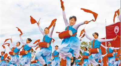 山東榮成市民文化活動公園,1000多名當地群眾敲起腰鼓,共同抒發(fā)走向全面小康生活的幸福與美好。 |