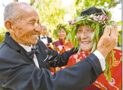 浙江省湖州市長興縣夾浦鎮(zhèn)長平村“歲月述金婚”活動現場,楊水良(左)為妻子楊富元佩戴愛的花環(huán)。 |