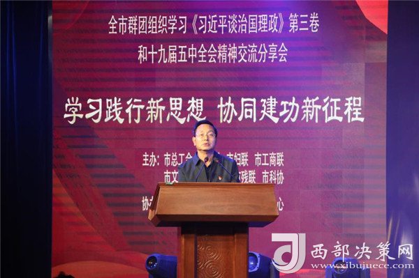 西部決策網(wǎng)訊 為深入貫徹習(xí)近平新時代中國特色社會主義思想,學(xué)習(xí)宣傳貫徹《習(xí)近平談治國理政》第三卷、黨的十九屆五中全會精神,加快群團(tuán)協(xié)同化建設(shè)進(jìn)程,11月5日,西寧市總工會牽頭召開市級群團(tuán)組織“學(xué)習(xí)踐行新思想  協(xié)同建功新征程”為主題的學(xué)習(xí)《習(xí)近平談治國理政》第三卷和黨的十九屆五中全會精神交流分享會,市委常委、宣傳部部長、市總工會主席王霞出席會議并講話。全市各群團(tuán)組織負(fù)責(zé)同志、勞模代表和干部職工群眾共300余人參加活動。