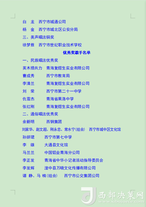 本次比賽旨在通過歌手們的激情演繹,增強(qiáng)全市廣大職工群眾的獲得感、幸福感、安全感,展現(xiàn)西寧市職工群眾的時(shí)代風(fēng)貌,進(jìn)一步營造弘揚(yáng)勞模精神、勞動(dòng)精神、工匠精神的濃厚氛圍,為更高水平打造綠色發(fā)展樣板城市建設(shè)新時(shí)代幸福西寧增強(qiáng)信心、凝聚力量。(后附獲獎(jiǎng)名單)。
