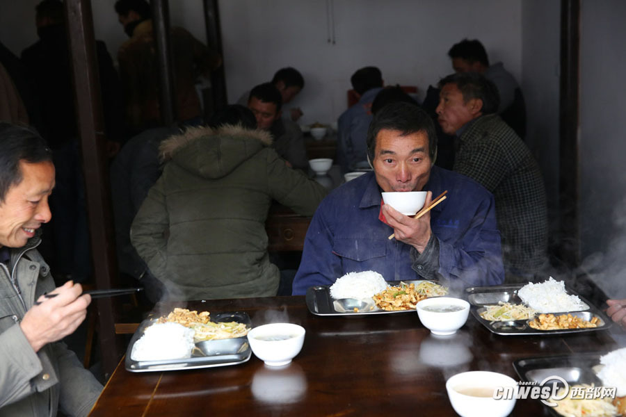 72行手藝人在作坊小鎮(zhèn)上班,中午到食堂吃免費工作餐。