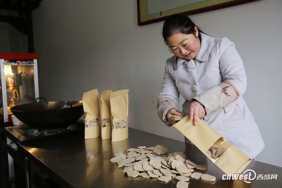 80后鄧國紅到作坊小鎮(zhèn)做花生芝麻糖。