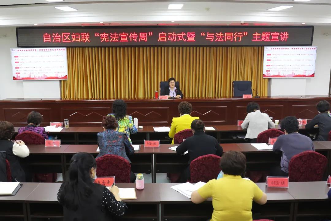 今年12月4日是第七個(gè)國(guó)家憲法日,也是我國(guó)第三個(gè)“憲法宣傳周”。今年的活動(dòng)主題為“深入學(xué)習(xí)宣傳習(xí)近平法治思想,大力弘揚(yáng)憲法精神”。為全面貫徹落實(shí)黨的十九屆五中全會(huì)精神和第三次中央新疆工作座談會(huì)精神,充分發(fā)揮婦聯(lián)組織的優(yōu)勢(shì)和作用,推動(dòng)憲法學(xué)習(xí)宣傳走入日常生活、走入干部群眾,11月30日, 自治區(qū)婦聯(lián)按照自治區(qū)黨委全面依法治疆委員會(huì)辦公室要求,舉辦了“憲法宣傳周”啟動(dòng)式暨“與法同行”主題宣講活動(dòng)。