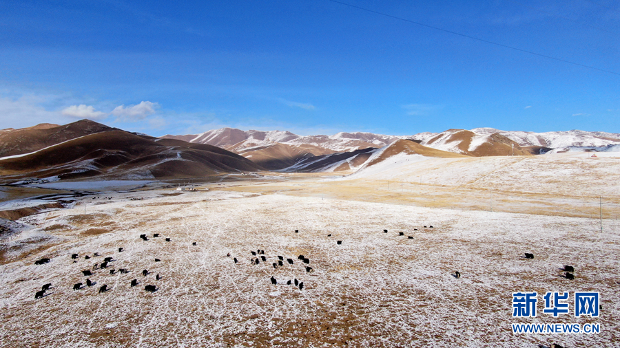 12月6日,牦牛在雪后的阿柔草原上活動(dòng)(無(wú)人機(jī)照片)。新華社記者 張宏祥 攝