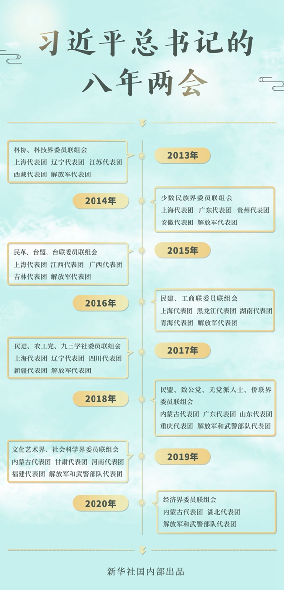 2013-2020,八年的全國(guó)兩會(huì)上,總書(shū)記46次到團(tuán)組參加審議討論。交流之中,語(yǔ)重心長(zhǎng);言談之間,發(fā)人深思。