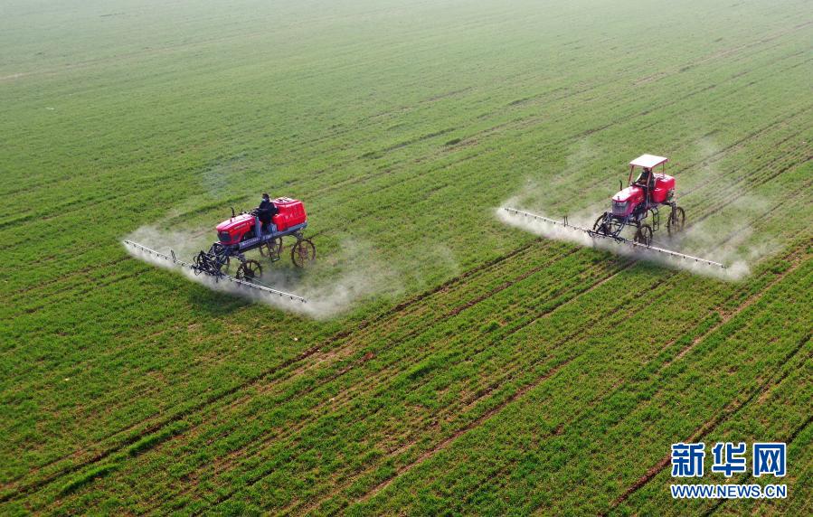 3月5日,河北省邢臺市南和區(qū)閻里鄉(xiāng)閻里村農(nóng)民操作農(nóng)業(yè)機(jī)械在麥田噴灑農(nóng)藥(無人機(jī)照片)。新華社記者 朱旭東 攝