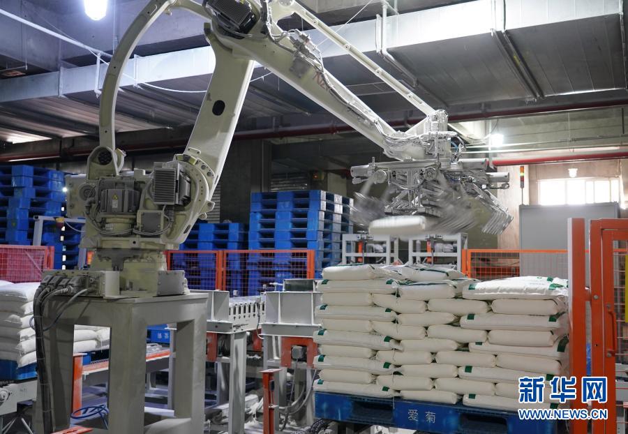 在西安國際港務(wù)區(qū)愛菊農(nóng)產(chǎn)品物流加工園區(qū)內(nèi),面粉生產(chǎn)線上的機(jī)械臂在碼放包裝好的面粉(2020年4月8日攝)。 新華社記者 邵瑞 攝