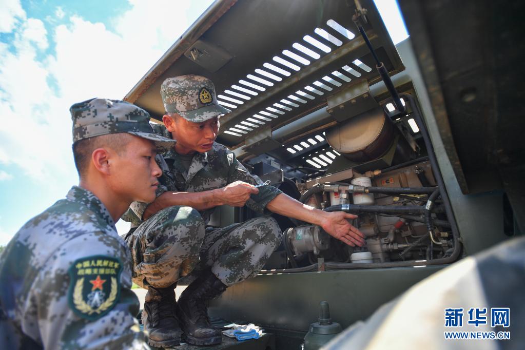 戰(zhàn)略支援部隊某大隊一級軍士長高玉華(右)現(xiàn)場指導(dǎo)排除工程機械故障(7月23日攝)。新華社記者 陳澤國 攝