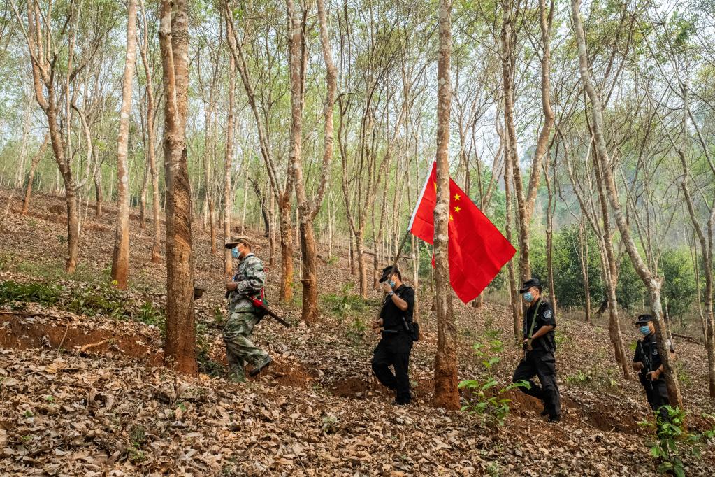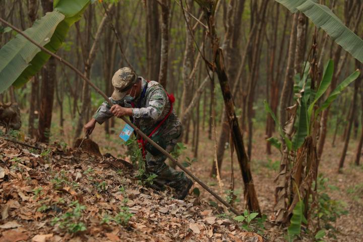 日前,記者跟隨段二文等人,走了一段他認(rèn)為很普通的巡邊路。當(dāng)天,熟悉路況的段二文走在最前面,遇到不好通過的地方,他拿著砍刀幾下就清除了障礙。隨后穿越一片橡膠林,經(jīng)過一條用來區(qū)分國境線的石板路,抵達(dá)最終的目的地——S144-2號(hào)界樁。