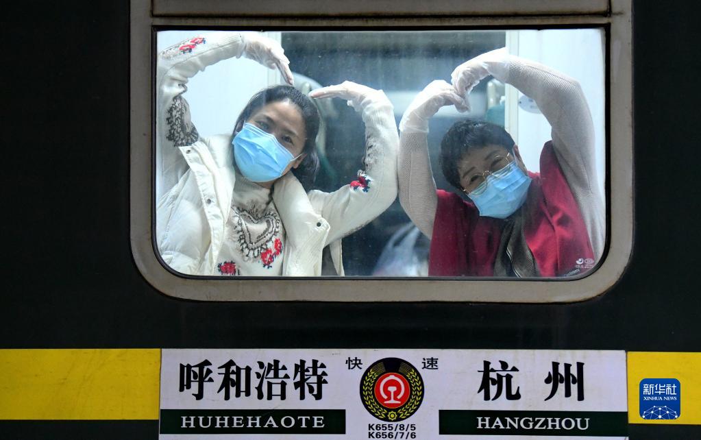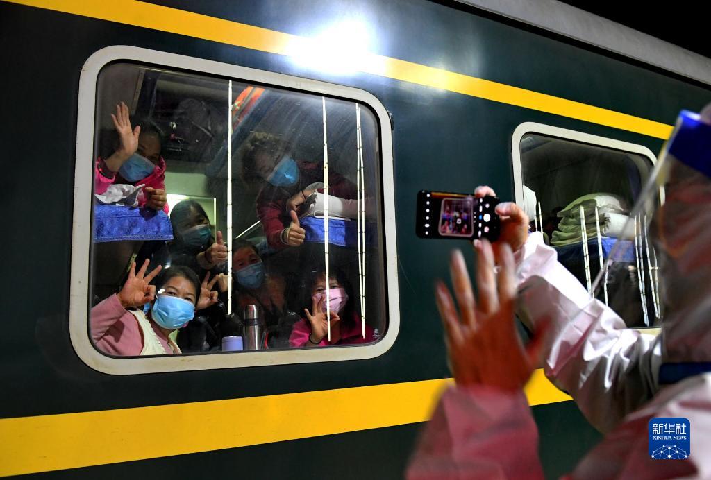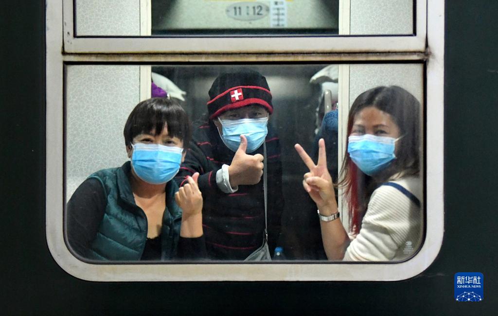 10月29日,滯留游客離開(kāi)額濟(jì)納旗時(shí),在列車(chē)車(chē)廂里與地面人員告別。新華社發(fā)(王磊 攝)