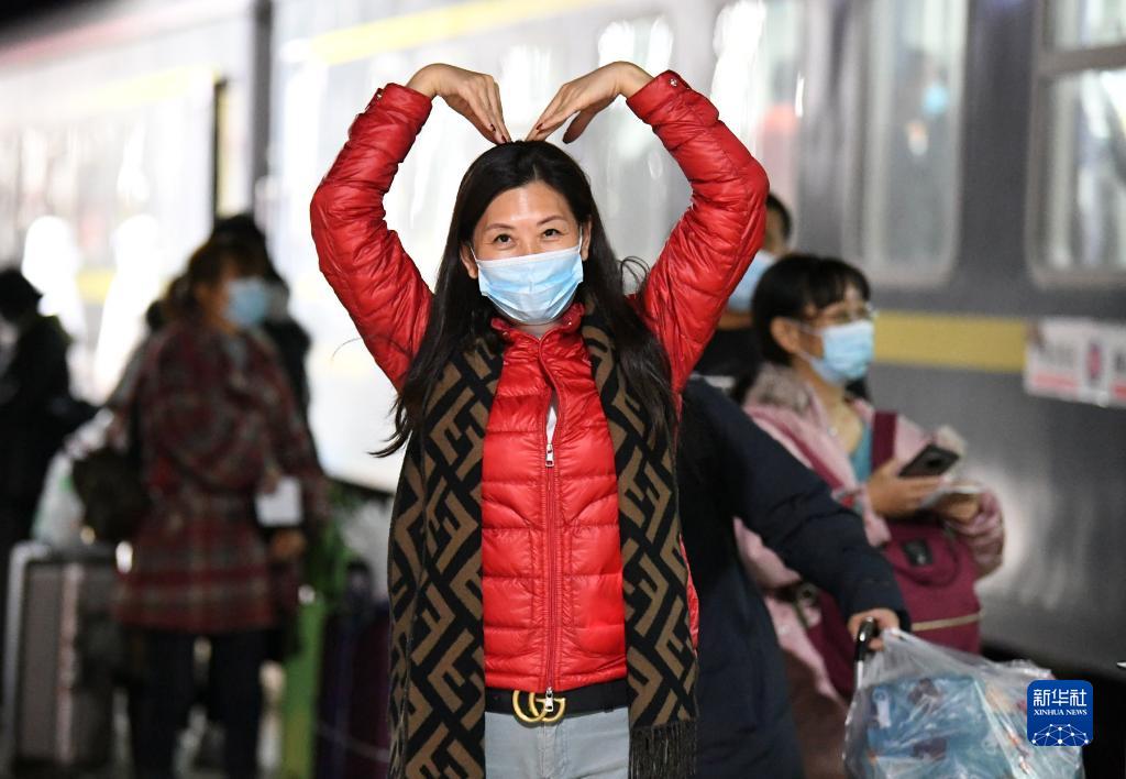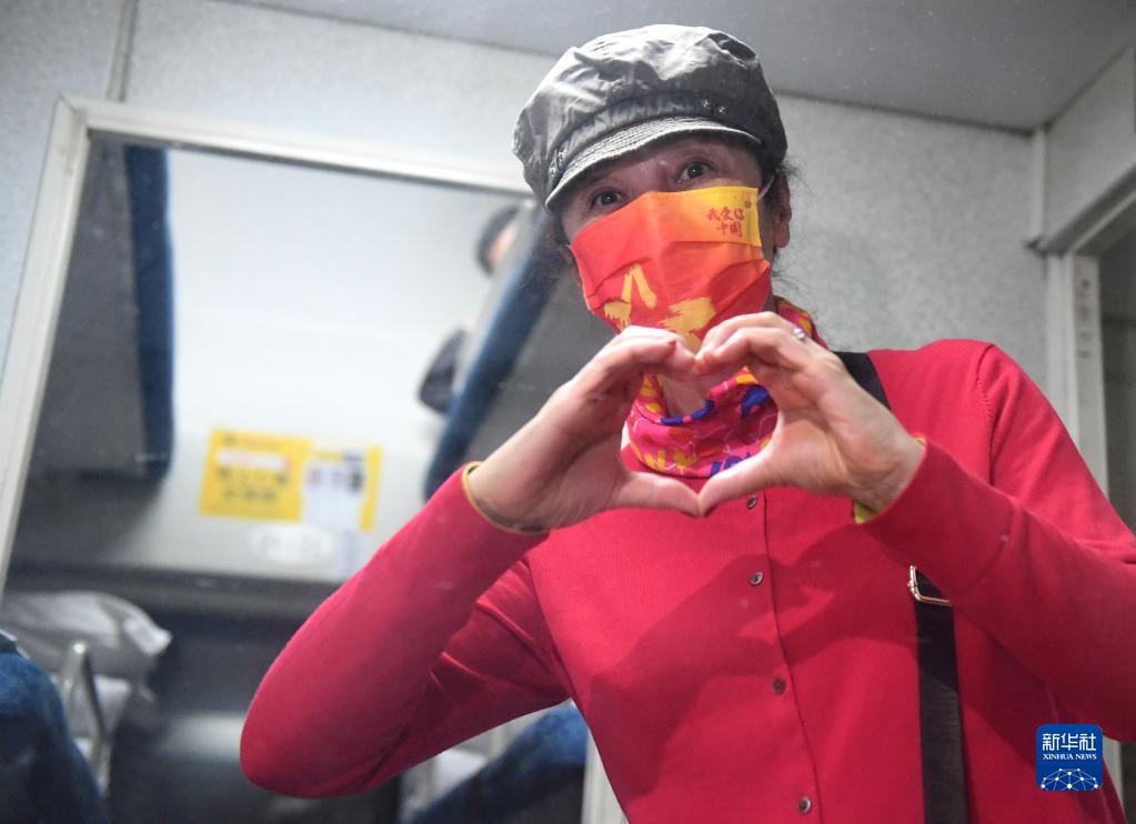 10月29日,一名滯留游客離開(kāi)額濟(jì)納旗時(shí),在列車(chē)車(chē)廂里用雙手比劃出“愛(ài)心”。新華社發(fā)(王磊 攝)