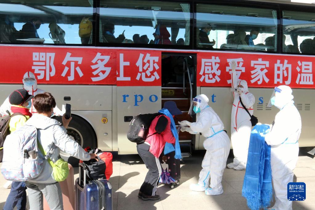 站臺(tái)外,一輛輛掛有“人民至上,生命至上”“鄂爾多斯讓您感受家的溫暖”等橫幅標(biāo)語(yǔ)的大客車(chē)旁,寫(xiě)有“伊金霍洛歡迎您”“康巴什歡迎您”“東勝歡迎您”的標(biāo)識(shí)牌,十分醒目。