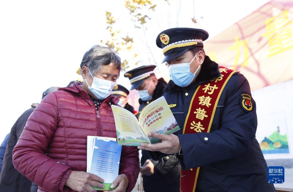 12月4日,在河北省邢臺市襄都區(qū)東郭村鎮(zhèn)南康莊村,普法志愿者在給村民進行普法宣傳。新華社發(fā)(張馳 攝)
