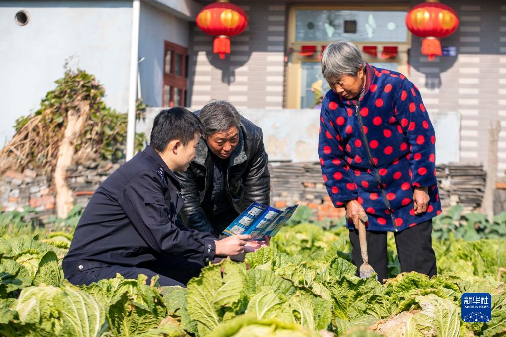 12月4日,江蘇省泰州市海陵區(qū)蘇陳派出所民警在蘇陳社區(qū)田間地頭向農(nóng)戶進行普法宣傳?!⌒氯A社發(fā)(湯德宏 攝)