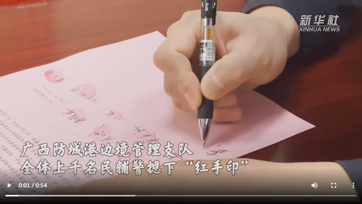 廣西防城港邊境管理支隊(duì)上千名民輔警集體遞交“戰(zhàn)疫請(qǐng)戰(zhàn)書”,主動(dòng)要求向抗疫最前線靠攏。他們繼續(xù)選擇逆行,奔赴國門口岸、邊境卡口、村寨社區(qū),始終奮戰(zhàn)在最前線,維護(hù)檢測(cè)現(xiàn)場秩序,保障救援力量通行,強(qiáng)化邊境巡邏防控。“請(qǐng)戰(zhàn)書”上的一個(gè)個(gè)“紅手印”,見證忠誠。