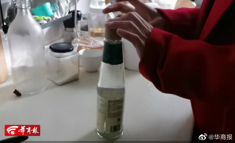 隨后又將家中用完的醬油瓶灌滿熱水