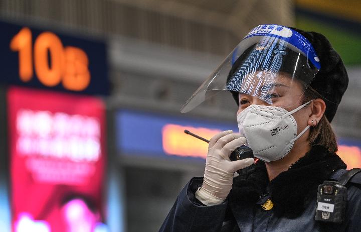 1月16日,工作人員對西安北站站臺進行消殺。新華社記者 陶明 攝