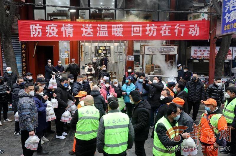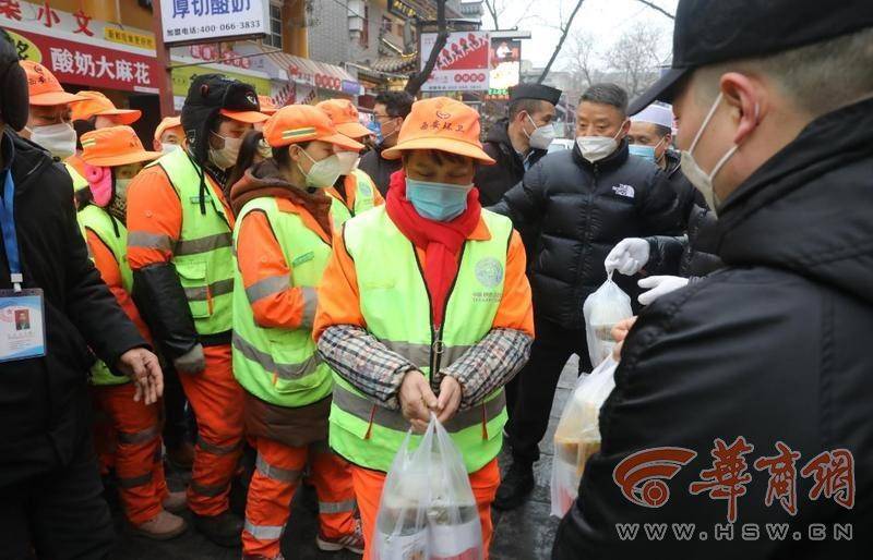 在回民街回坊老孫家泡饃店,服務(wù)員正在給周邊環(huán)衛(wèi)工免費(fèi)提供午飯。“自疫情嚴(yán)控以來(lái),我們每天為周邊參加一線防疫工作者近千份清真熟食,以感謝他們對(duì)西安市防疫做出的貢獻(xiàn)。”該店負(fù)責(zé)人說(shuō)。