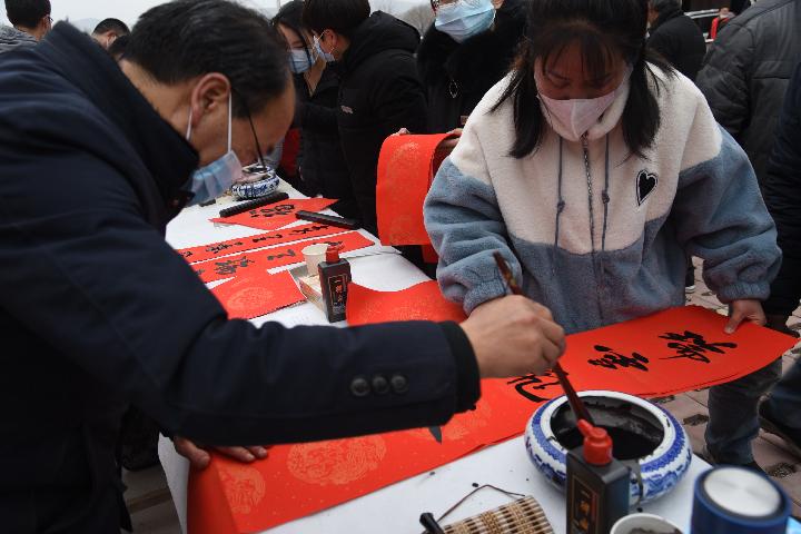 1月24日,厙弆村“三下鄉(xiāng)”現(xiàn)場,書法愛好者為群眾書寫春聯(lián)。(新華社記者崔翰超 攝)