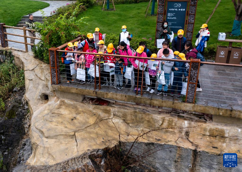 4月17日,參加活動(dòng)的中小學(xué)生在地質(zhì)專業(yè)工作人員的帶領(lǐng)下,對(duì)銅鑼山礦山公園的地質(zhì)遺跡和生態(tài)修復(fù)進(jìn)行科學(xué)考察(無(wú)人機(jī)照片)。