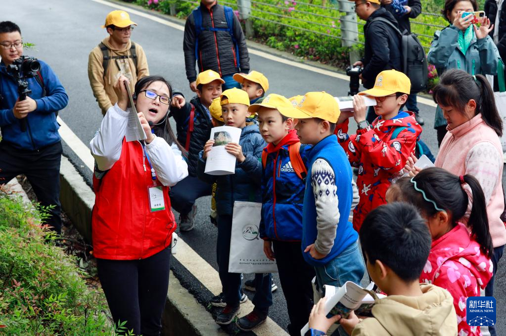 4月17日,參加活動(dòng)的地學(xué)旅游愛好者、中小學(xué)生和部分媒體工作者,在地質(zhì)專業(yè)工作人員的帶領(lǐng)下進(jìn)行銅鑼山科學(xué)考察。