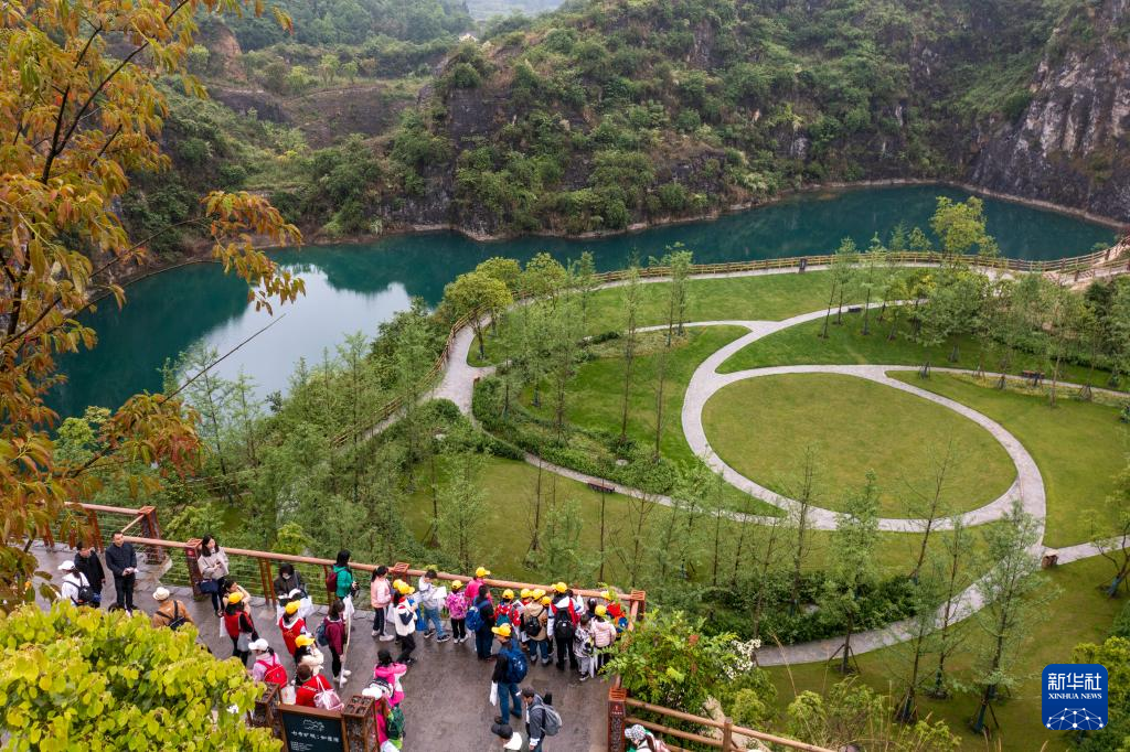 4月17日,地學(xué)旅游愛好者、中小學(xué)生和部分媒體工作者在地質(zhì)專業(yè)工作人員的帶領(lǐng)下,對(duì)銅鑼山礦山公園的地質(zhì)遺跡和生態(tài)修復(fù)進(jìn)行科學(xué)考察(無(wú)人機(jī)照片)。