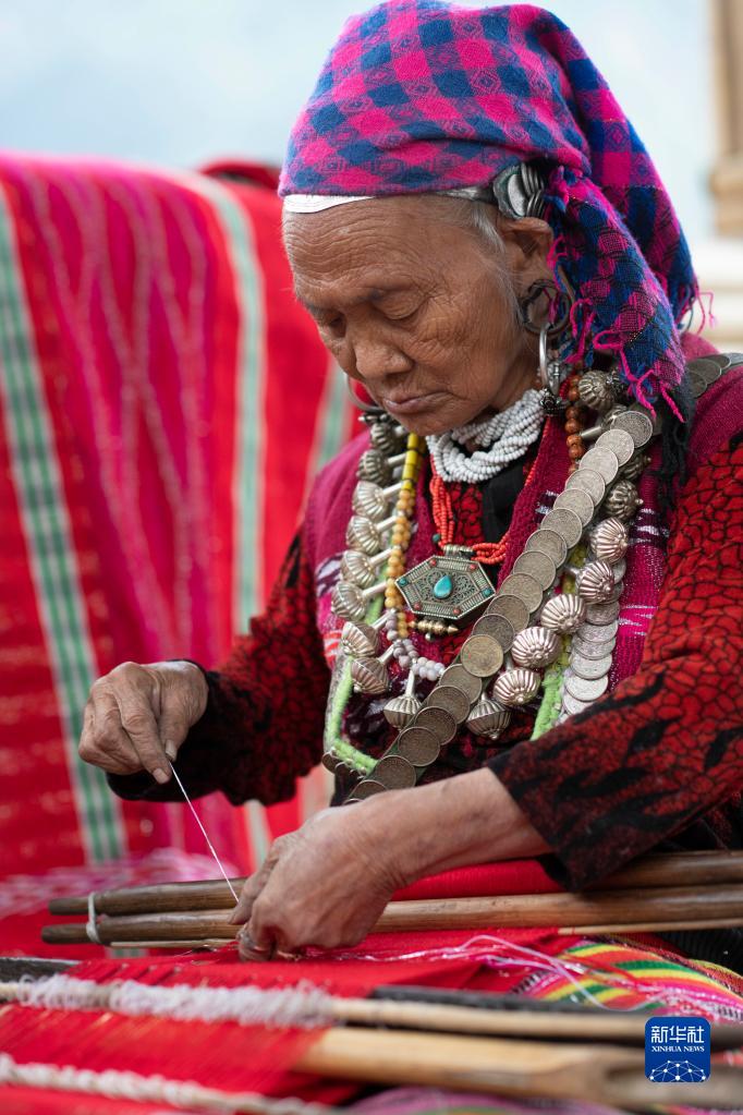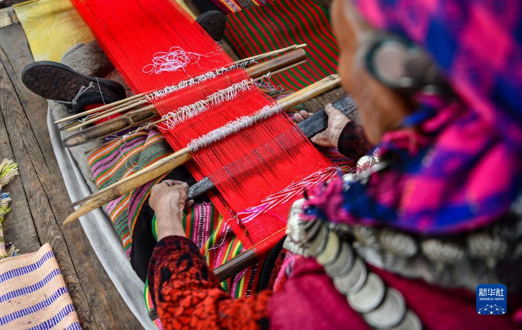 今年72歲的本央老人,是僜人服飾制作技藝西藏自治區(qū)級非遺傳承人。在西藏林芝市察隅縣沙瓊村,老人身著傳統(tǒng)的僜人服飾,在自家的涼亭里編織布料。