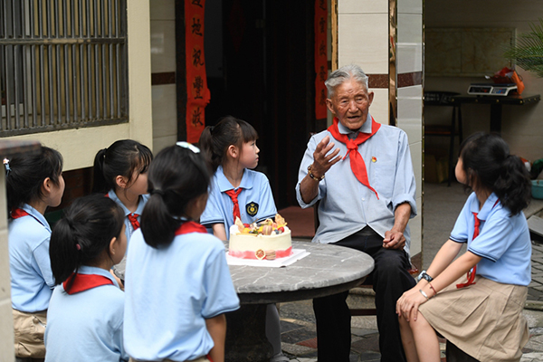 2020年6月28日,浙江省湖州市吳興區(qū)八里店鎮(zhèn)組織小學(xué)生開(kāi)展“童心向黨”主題繪畫(huà)、聆聽(tīng)老黨員講故事、參觀紅色教育基地等活動(dòng)。圖為吳興區(qū)第一小學(xué)學(xué)生聆聽(tīng)八里店鎮(zhèn)前村村老黨員陳金茂(右二)講故事。新華社記者 黃宗治/攝