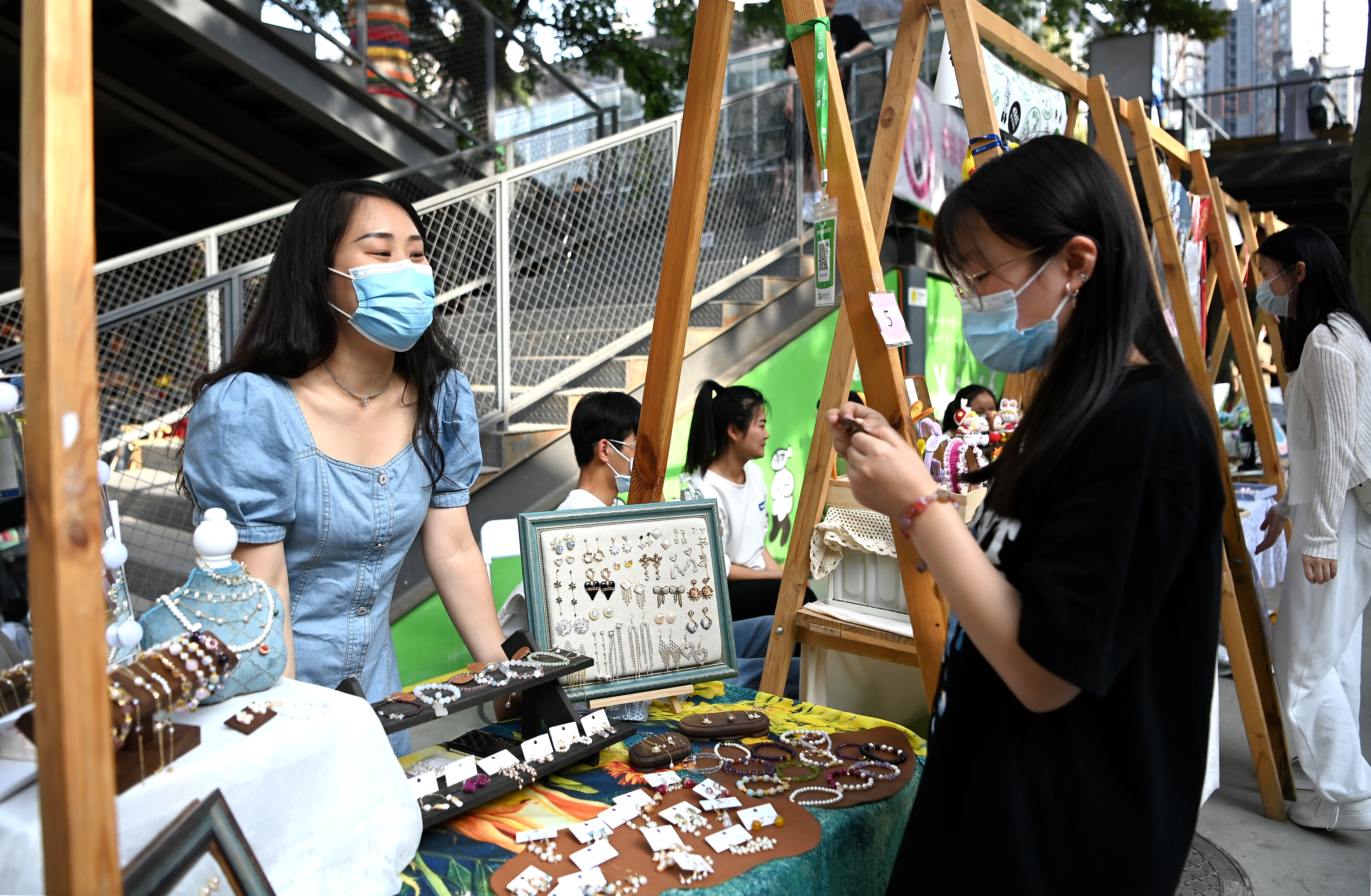 市民在西安際華3511文創(chuàng)科技園內(nèi)的市集上挑選飾品(5月20日攝)。 新華社記者 劉瀟 攝
