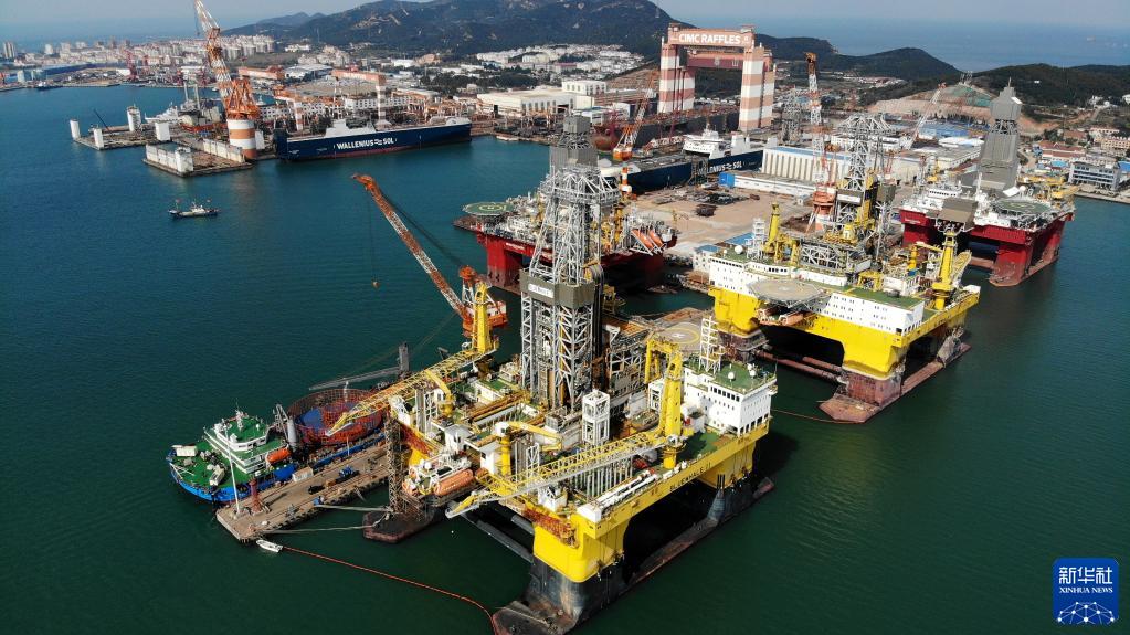 “藍(lán)鯨1號”(前右)及姊妹平臺“藍(lán)鯨2號”(前左)在其生產(chǎn)基地中集來福士海洋工程有限公司煙臺基地進行維護和保養(yǎng)(2021年10月18日攝,無人機照片)。新華社記者李紫恒攝