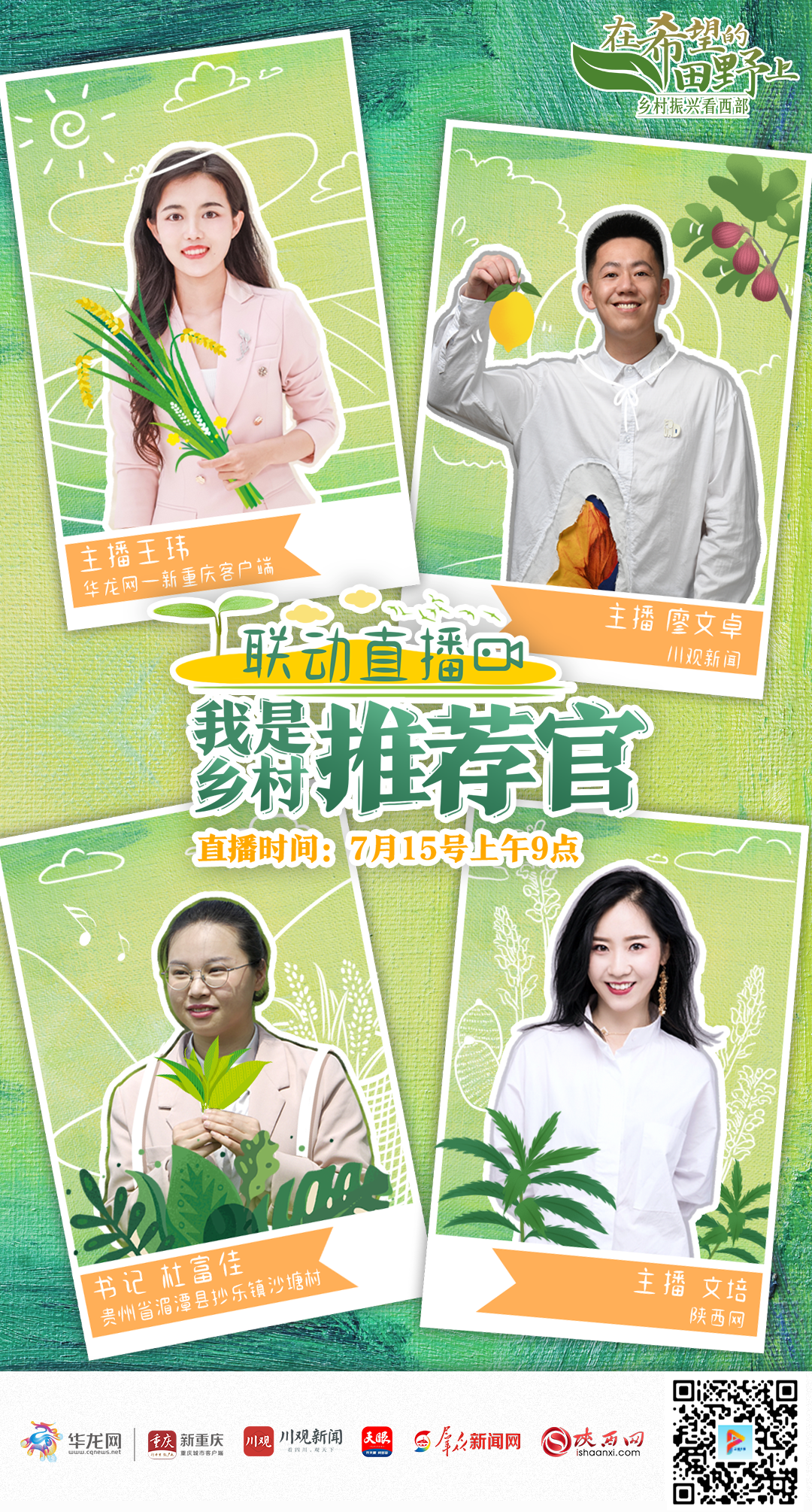 “鄉(xiāng)村推薦官”華龍網(wǎng)-新重慶客戶端主播王瑋、川觀新聞主播廖文卓、貴州省湄潭縣抄樂鎮(zhèn)沙塘村第一書記杜富佳、陜西網(wǎng)主播文培帶你走進(jìn)希望的田野,品美食、看美景、體驗(yàn)非遺特色,通過直播沉浸式打探各具特色的美麗鄉(xiāng)村,讓大家看到不一樣的西部!本次聯(lián)動直播還特別設(shè)置了抽獎環(huán)節(jié),15日上午9:00,敬請鎖定直播間!