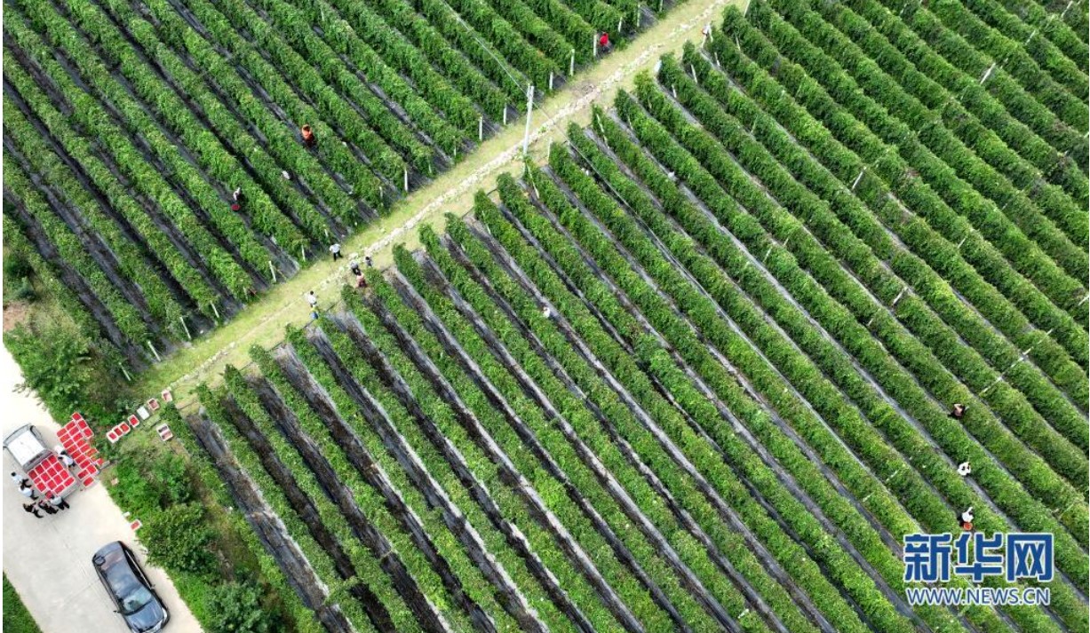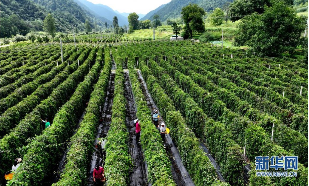 8月21日,洛南縣煜正中藥材專業(yè)合作社的員工在田間采摘五味子(無人機(jī)照片)。新華社記者 陶明 攝