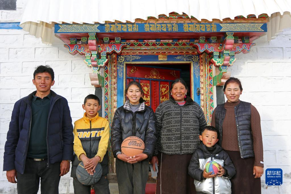 林芝市嘎拉村村民達(dá)瓦堅(jiān)參(左一)一家在家門口合影(2022年2月23日攝)。新華社記者 姜帆 攝