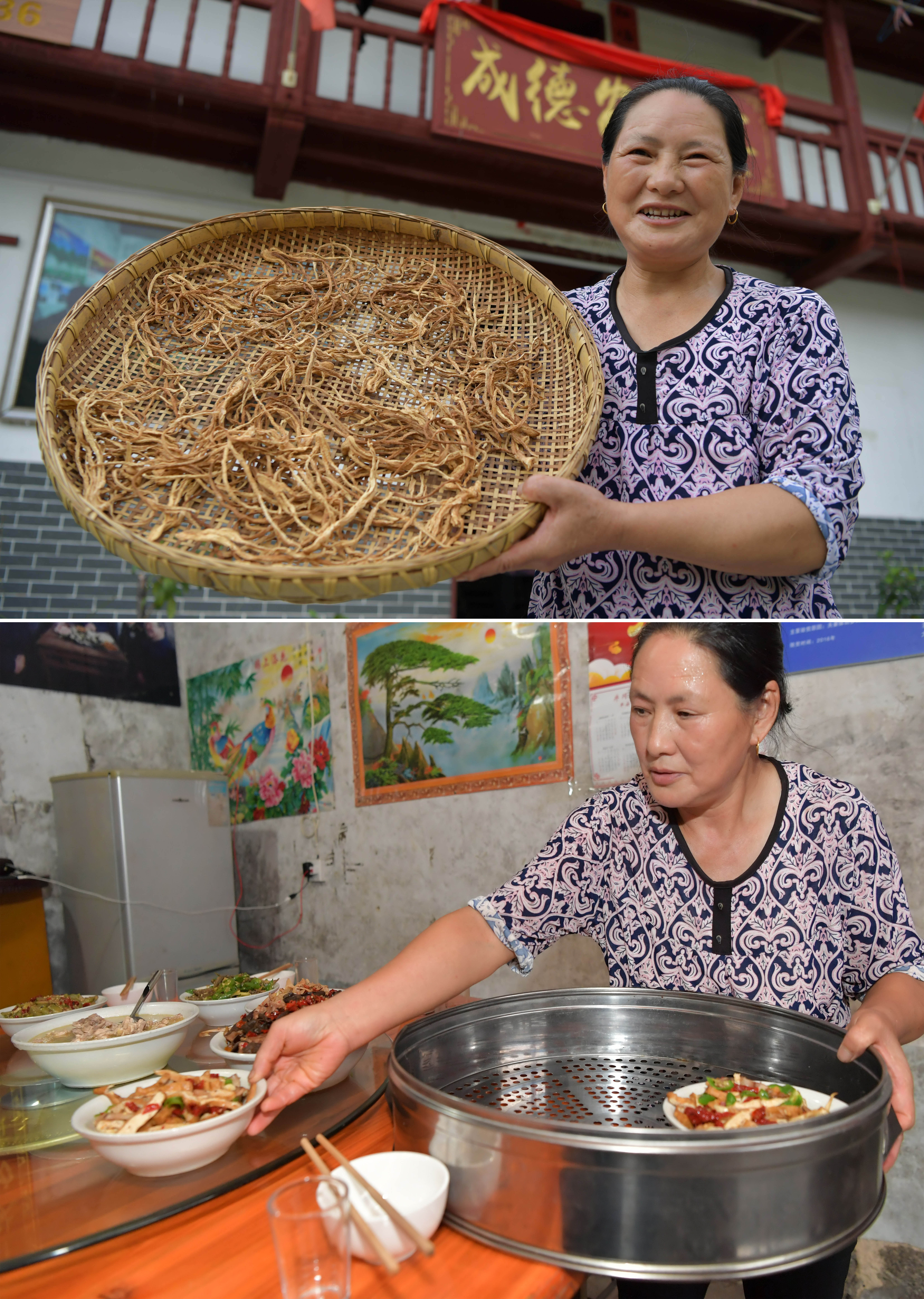 拼版照片:上圖為江西省井岡山市神山村村民彭夏英在自己開辦的農(nóng)家樂內(nèi)展示她家自制的當(dāng)?shù)靥禺a(chǎn);下圖為彭夏英在農(nóng)家樂內(nèi)給顧客上菜(2020年7月15日攝)。新華社記者 彭昭之 攝