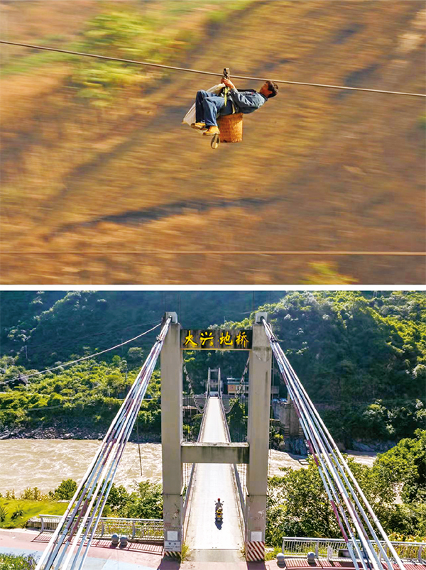 “過(guò)江靠溜索”曾是怒江兩岸群眾出行的重要方式。2013年,國(guó)家實(shí)施“溜索改橋”項(xiàng)目,幫助西部邊遠(yuǎn)山區(qū)群眾結(jié)束溜索時(shí)代,怒江州怒江段上溜索被改造為各式跨江橋梁,完成了沿江人民“天塹變通途”的企盼。上圖為2013年2月2日,在云南省怒江州瀘水市六庫(kù)街道,一名居民背著背簍溜索過(guò)江(新華社記者 王長(zhǎng)山/攝)。下圖為2022年9月13日,瀘水市居民騎摩托車(chē)通過(guò)大興地橋(無(wú)人機(jī)照片,新華社記者 江文耀/攝)。