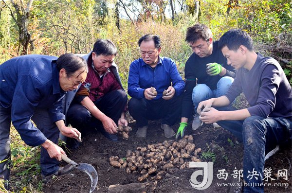 金秋十月,碩果累累。10月18日下午,在海拔1500多米,漫山紅遍、層林盡染的陜西省漢中市寧強(qiáng)縣陽平關(guān)鎮(zhèn)伍家壩村磨刀寨的山林里,寧強(qiáng)縣財(cái)政局派駐伍家壩村第一書記唐賢斌、寧強(qiáng)縣天麻研究所的專家張懷榮與天麻種植大戶朱清衛(wèi)、劉堂勇、成溫斌等人正在查看天麻的收成、準(zhǔn)備采挖豐收的天麻。