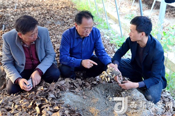10月18日,伍家壩村第一書記唐賢斌(中)正在天麻繁育基地查看零代天麻種子生長情況。