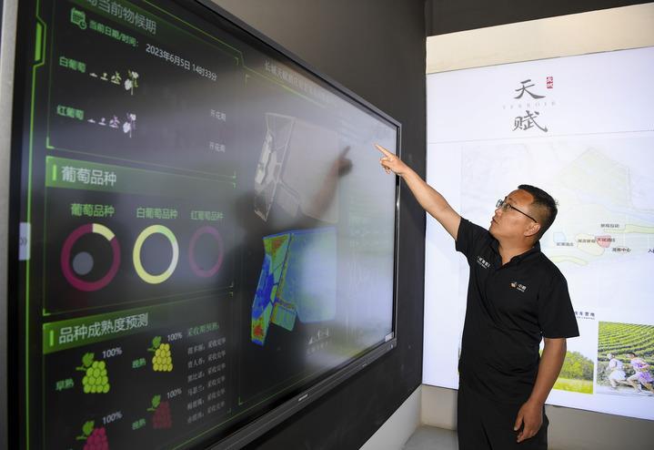 6月5日,中糧長城天賦酒莊總經(jīng)理都振江在介紹酒莊的智慧葡萄園灌溉數(shù)據(jù)平臺。新華社記者 馮開華 攝