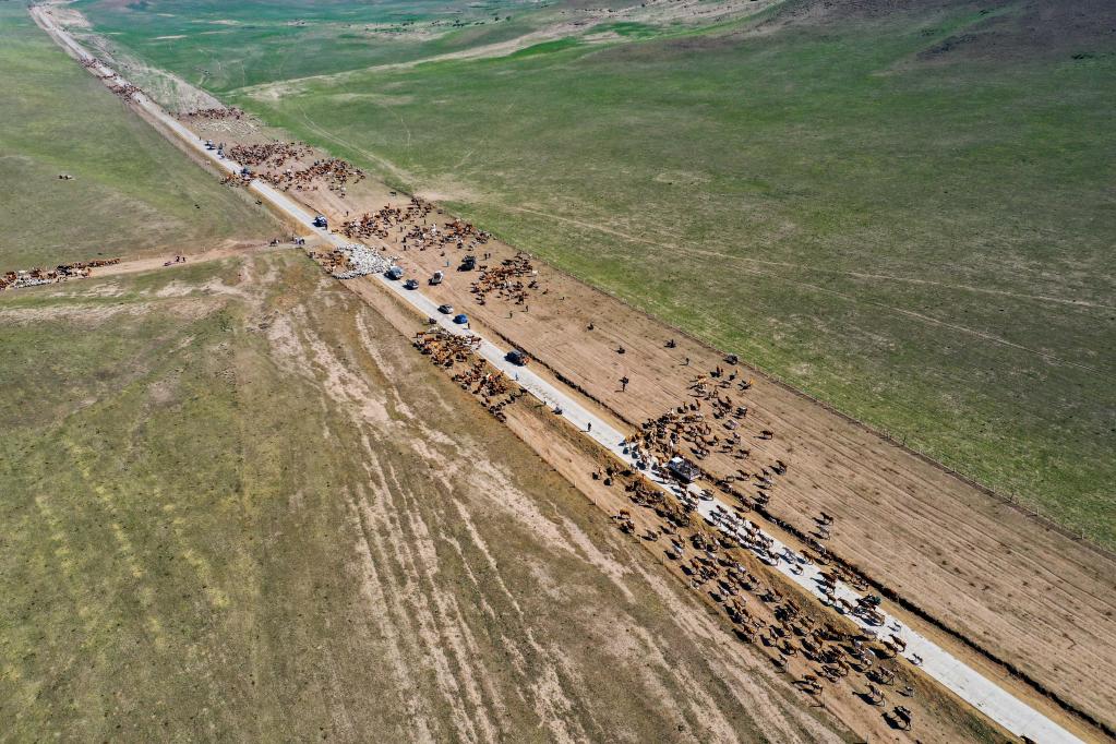 6月15日,牧民們趕著畜群行走在遷徙道路上(無人機照片)。新華社記者 連振攝