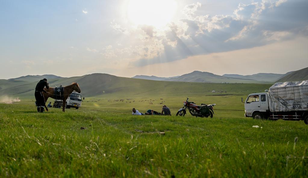 6月16日,額爾敦巴特爾和鄰居們躺在草地上休息。新華社記者連振 攝