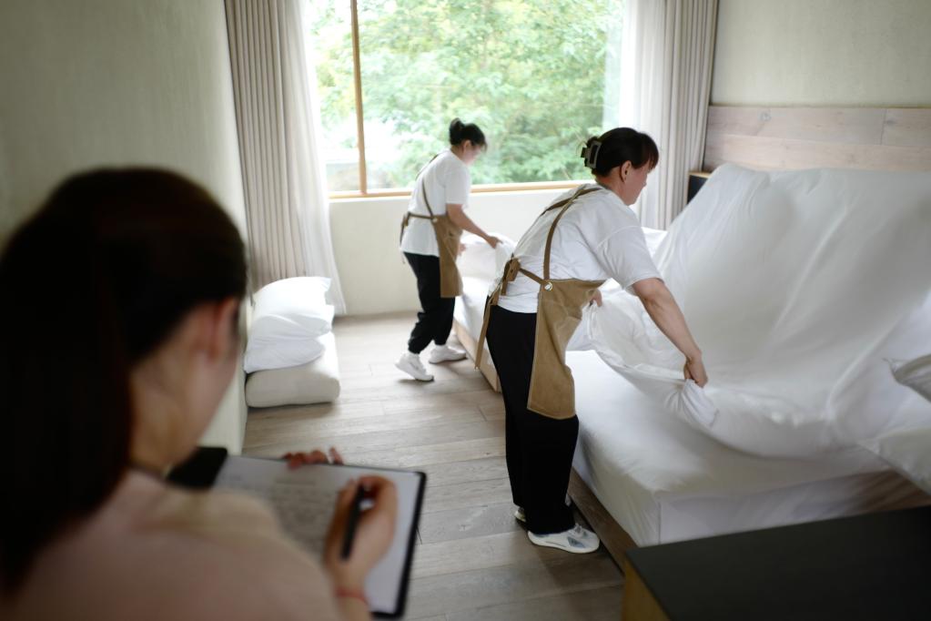 學(xué)員在莫干山民宿管家培訓(xùn)中心內(nèi)進(jìn)行房務(wù)考核。新華社記者徐中哲 攝
