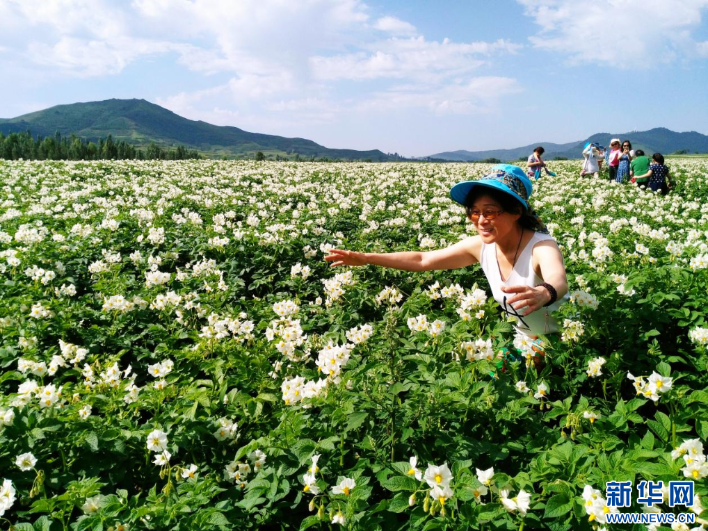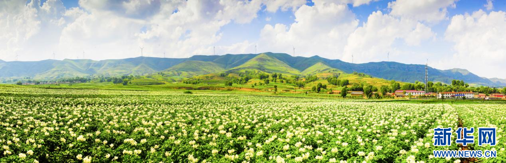 八月,青山環(huán)抱的黃土坡上,土豆花成團成簇盛開,連成一片花海。