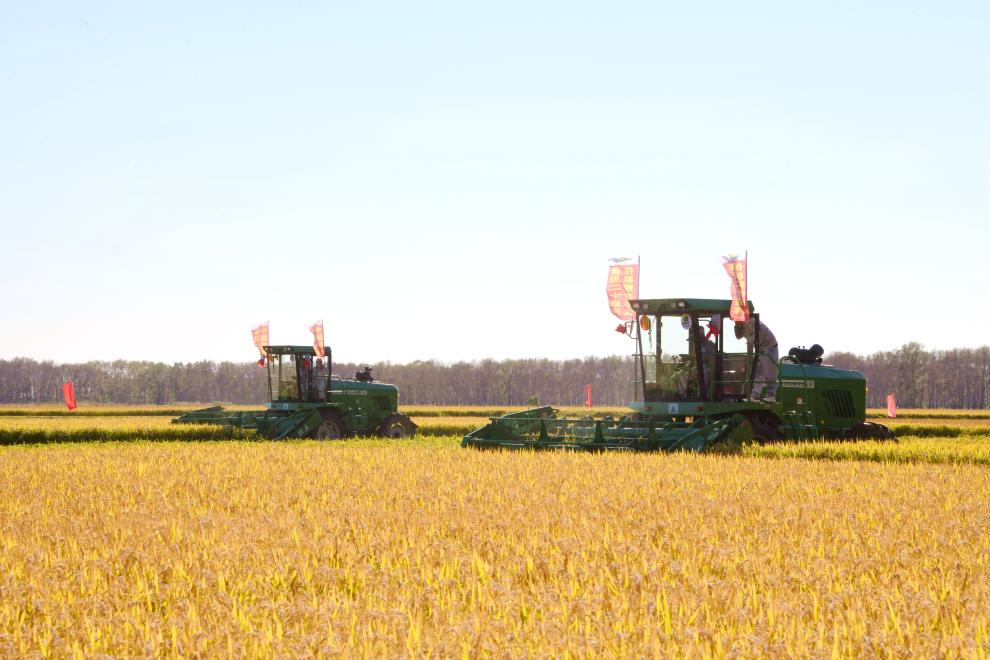 金秋九月,北大荒千里沃野一片金黃。在北大荒集團軍川農場有限公司福源管理區(qū)水稻地塊,一臺臺收割機、割曬機正在進行收獲作業(yè)。種植戶楊明成在農技人員的指導下率先開鐮,采取直收和割曬拾禾相結合的方式進行收獲。